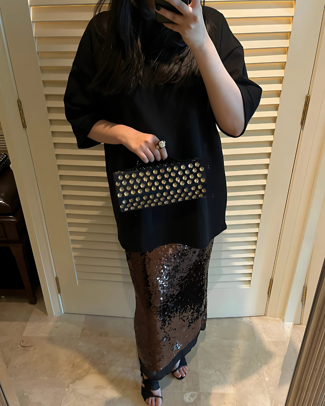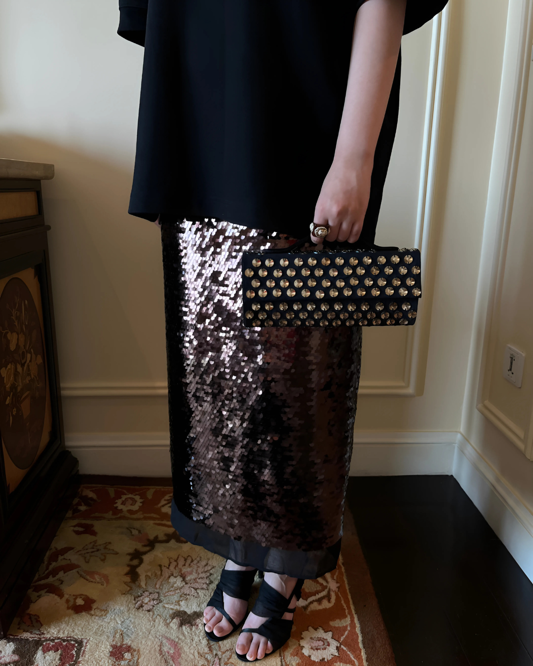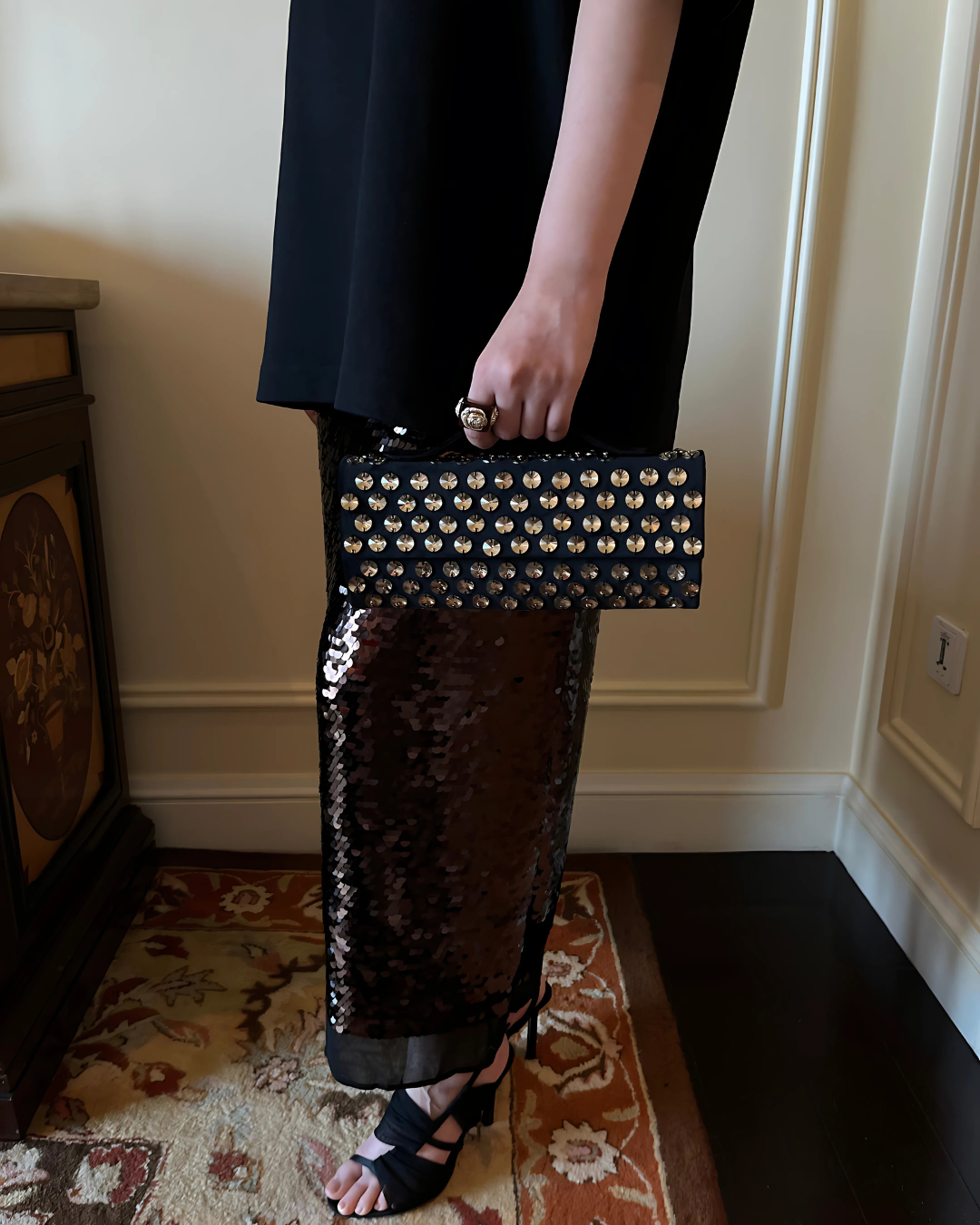 A structural bag constructed with black velvet, and hand-embellished with round dusky gold rivoli crystals; the new re-imaged Dusky Gold Polka - Fūtō Bag is a chic-electric carryall. The front flap has a hidden double magnetic fastening. The top handle brings the baguette clutch sophistication and ease.