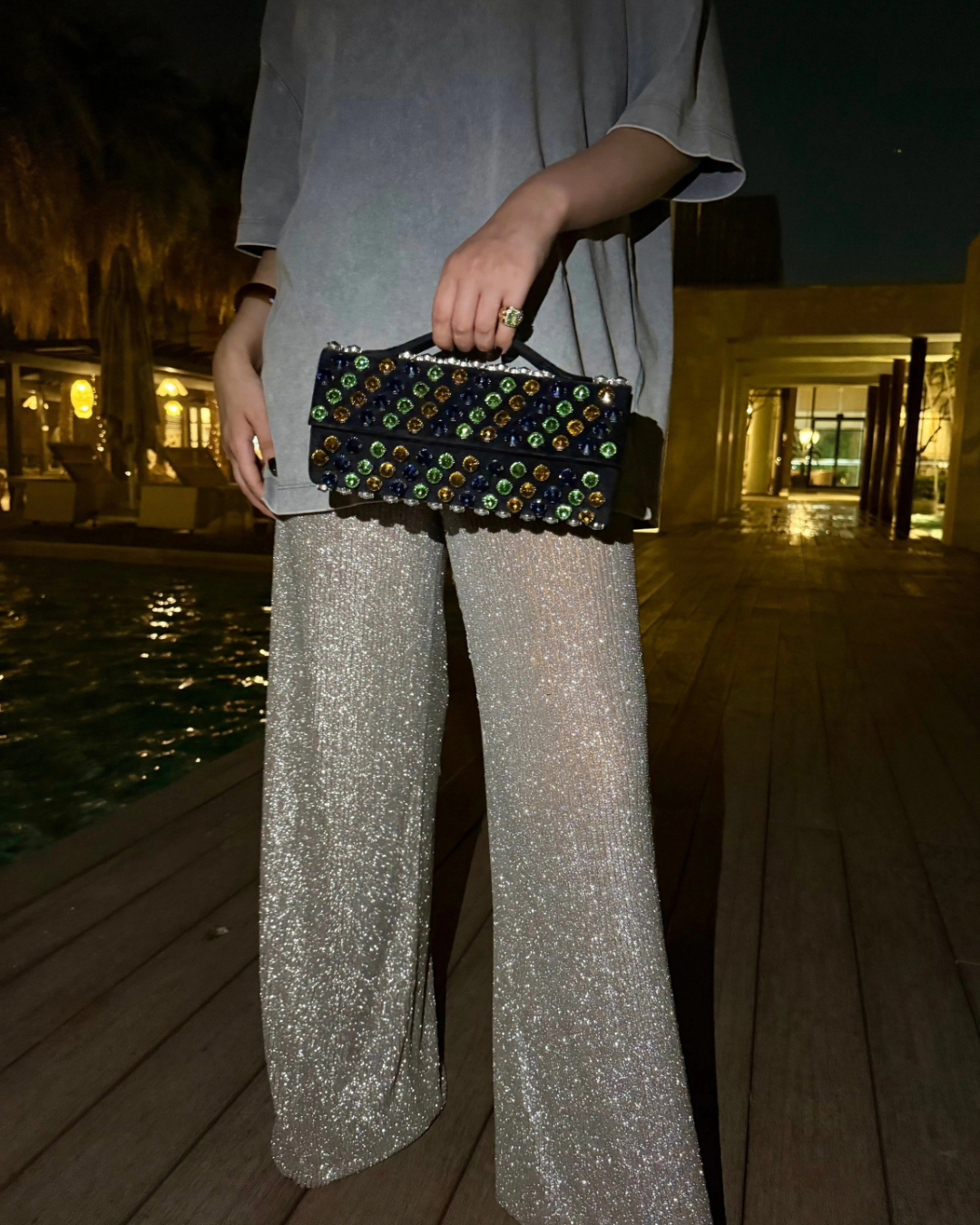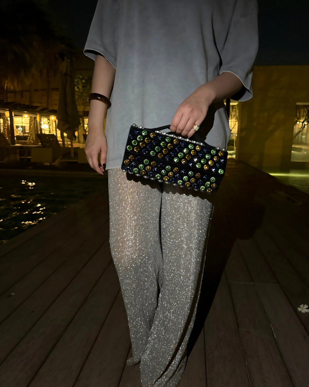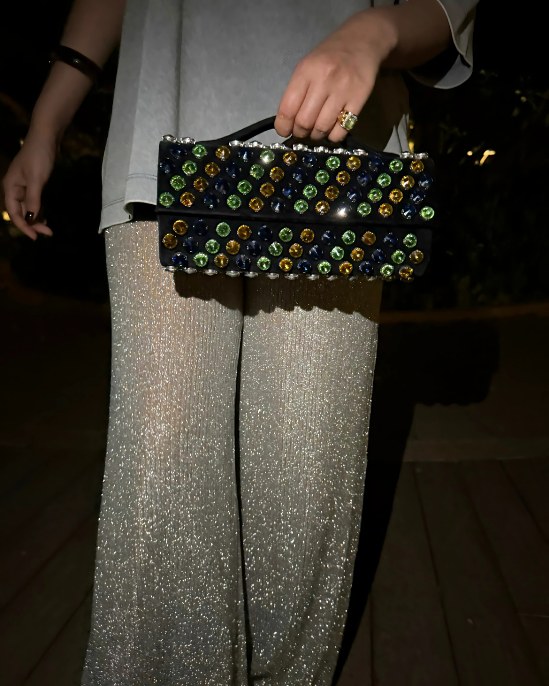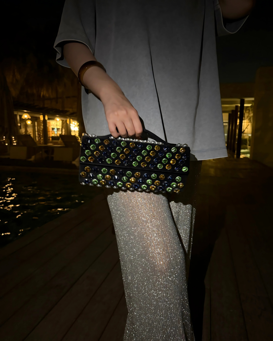 A structural bag constructed with black velvet, and hand-embellished with round honey yellow, peridot, and cobalt blue preciosa crystals; the new re-imaged Summer Disco- Fūtō Bag is an electric and spicy East-West Bag. The front flap has a hidden double magnetic fastening. The top handle brings the baguette clutch sophistication and ease.