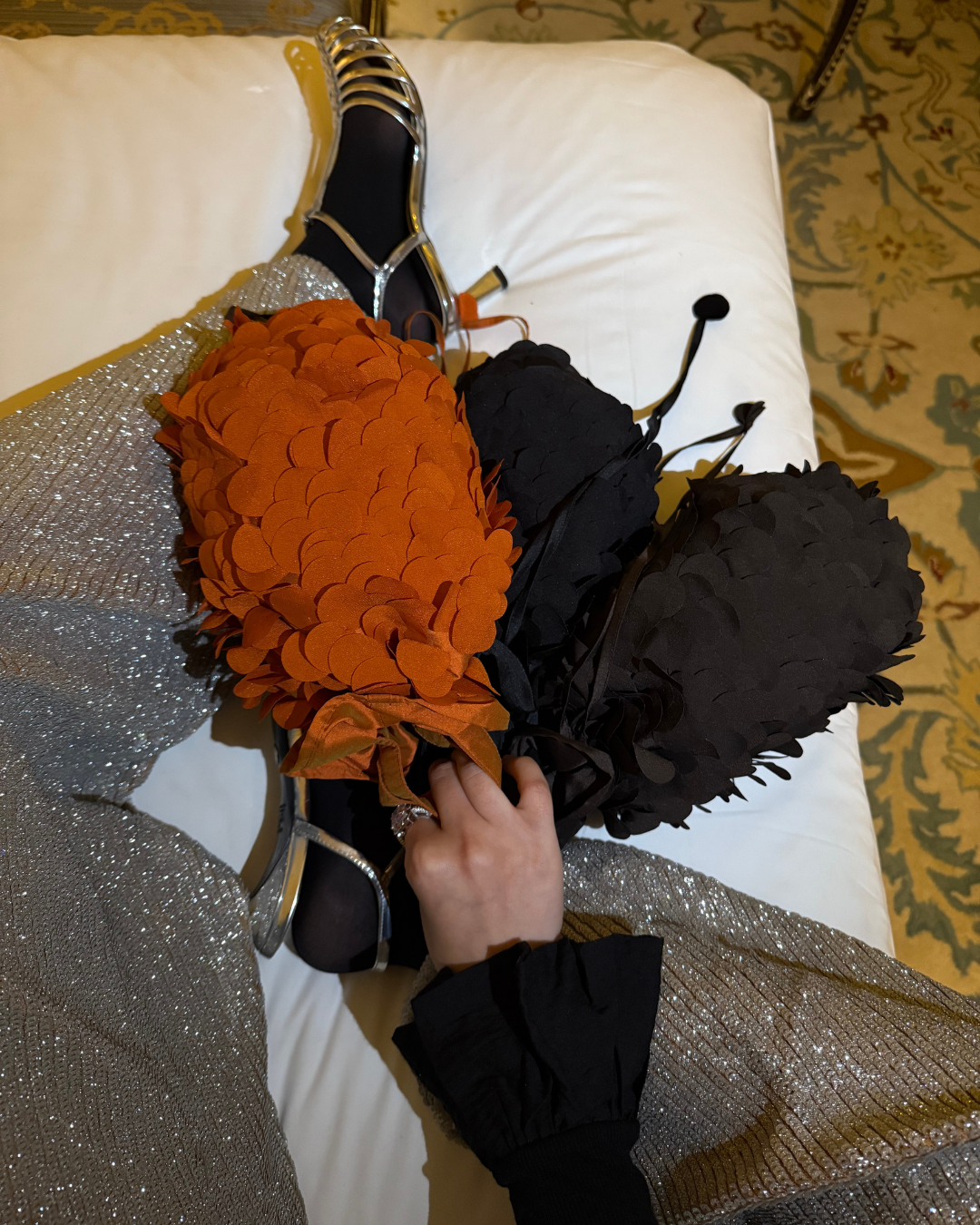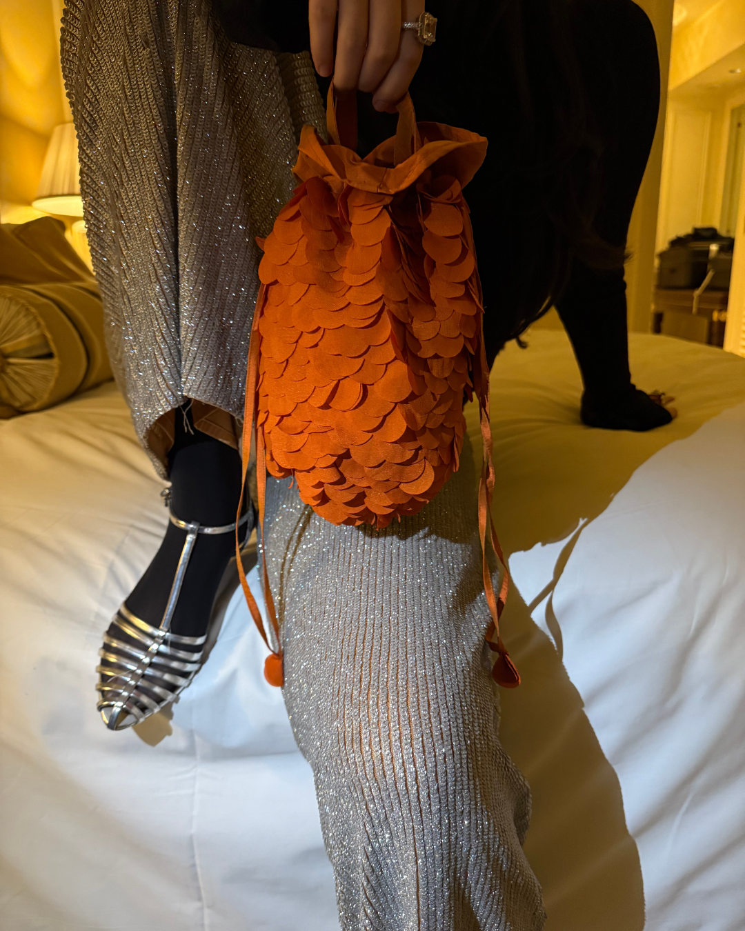 An eye-catching bucket bag - The Armor Rocky Bucket bag is fashioned in orange taffeta and shrouded with hundreds of laser cut discs.