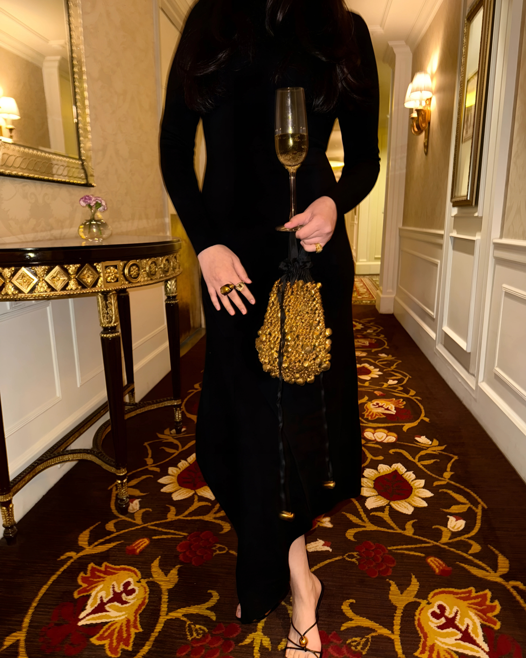 The Jhoom Rocky Bucket Bag is fashioned in black taffeta, hand-embellished with hundreds of gold ghungroo of varying sizes to create a beautiful, undulating texture. It’s dramatic and dreamy and all consuming.