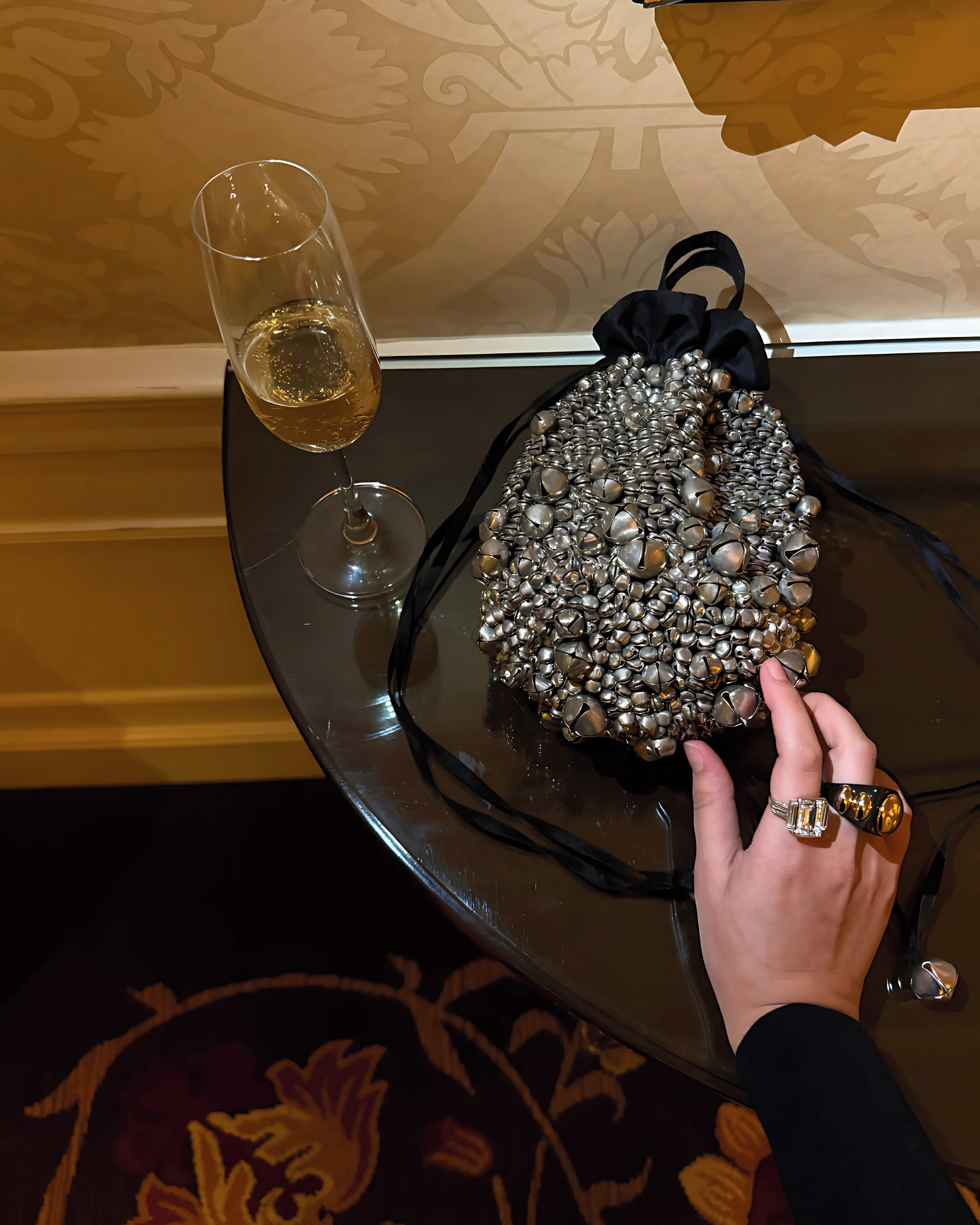 The Jhoom Rocky Bucket Bag is fashioned in black taffeta, hand-embellished with hundreds of silver ghungroo of varying sizes to create a beautiful, undulating texture. It’s dramatic and dreamy and all consuming.