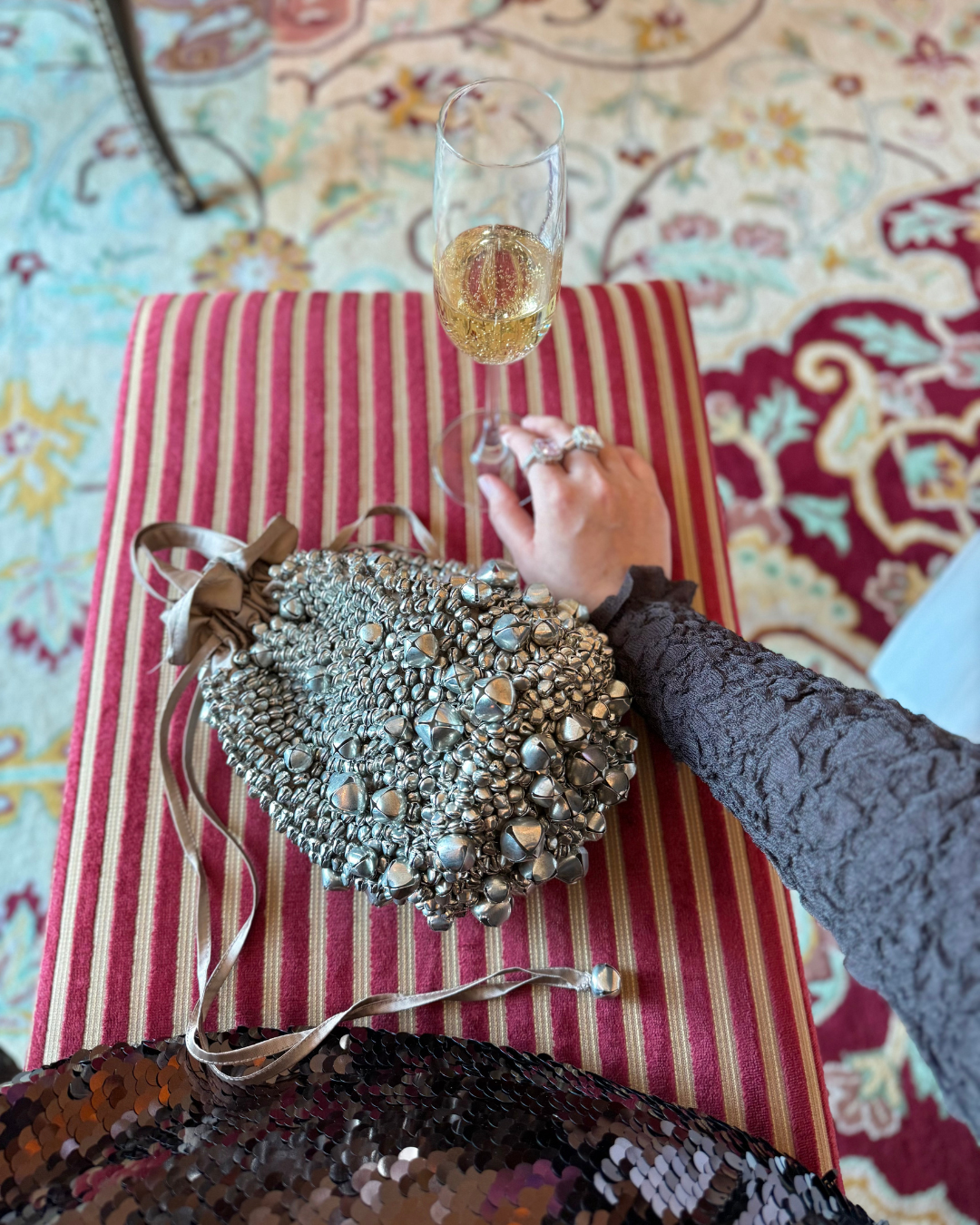 The Jhoom Rocky Bucket Bag is fashioned in nude taffeta, hand-embellished with hundreds of silver ghungroo of varying sizes to create a beautiful, undulating texture. It’s dramatic and dreamy and all consuming.