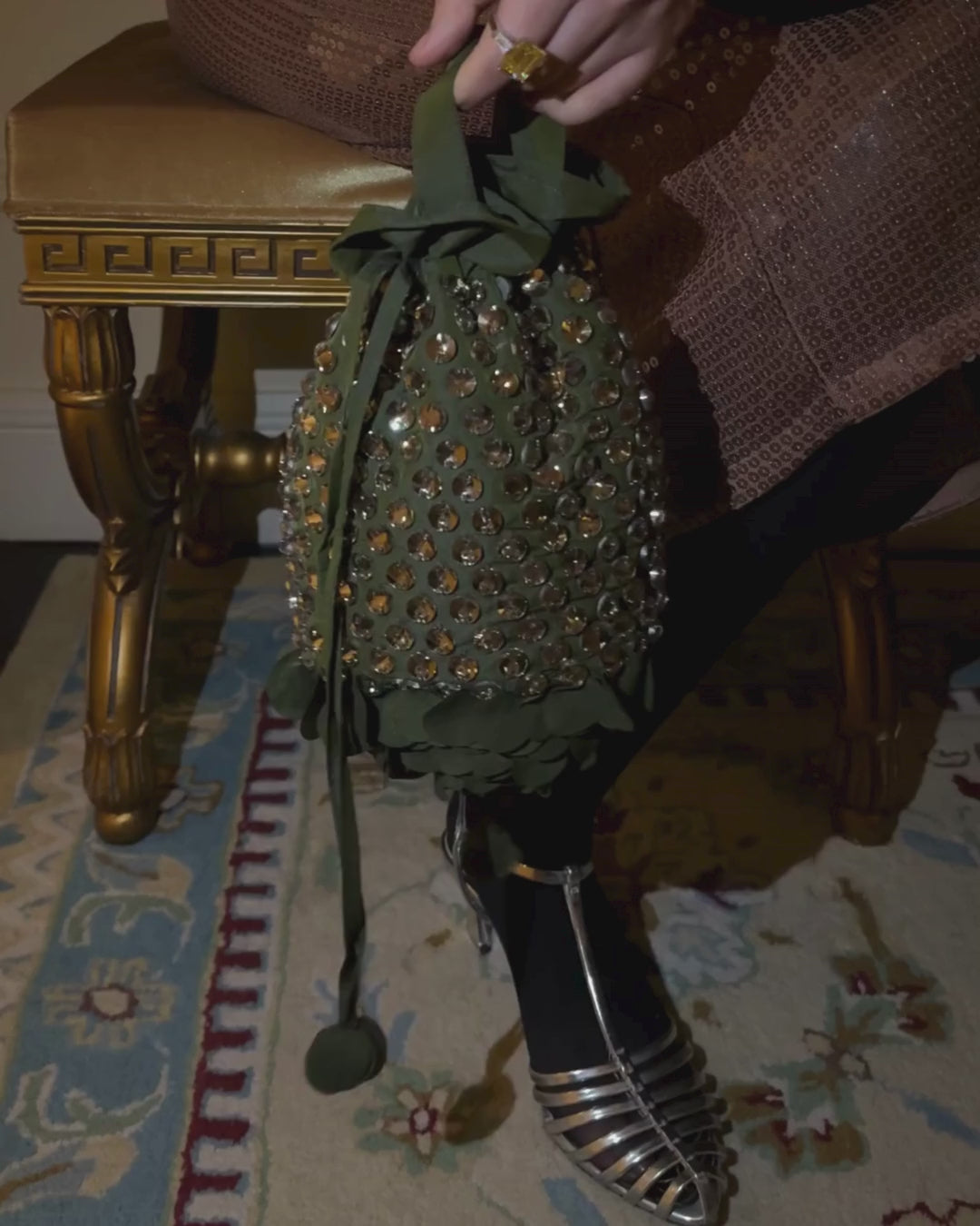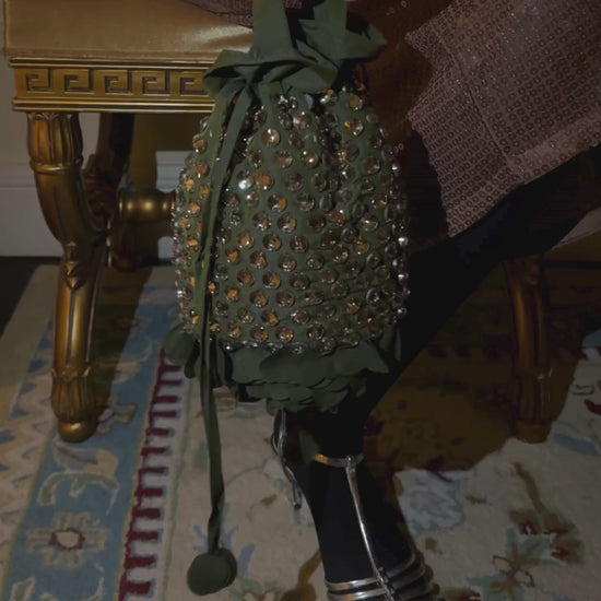 An eye-catching bucket bag - The Siren Rocky Bucket Bag is fashioned in olive green taffeta. The main body is hand-embellished with dusky gold crystals, and its spherical bottom is shrouded with hundreds of laser cut discs.